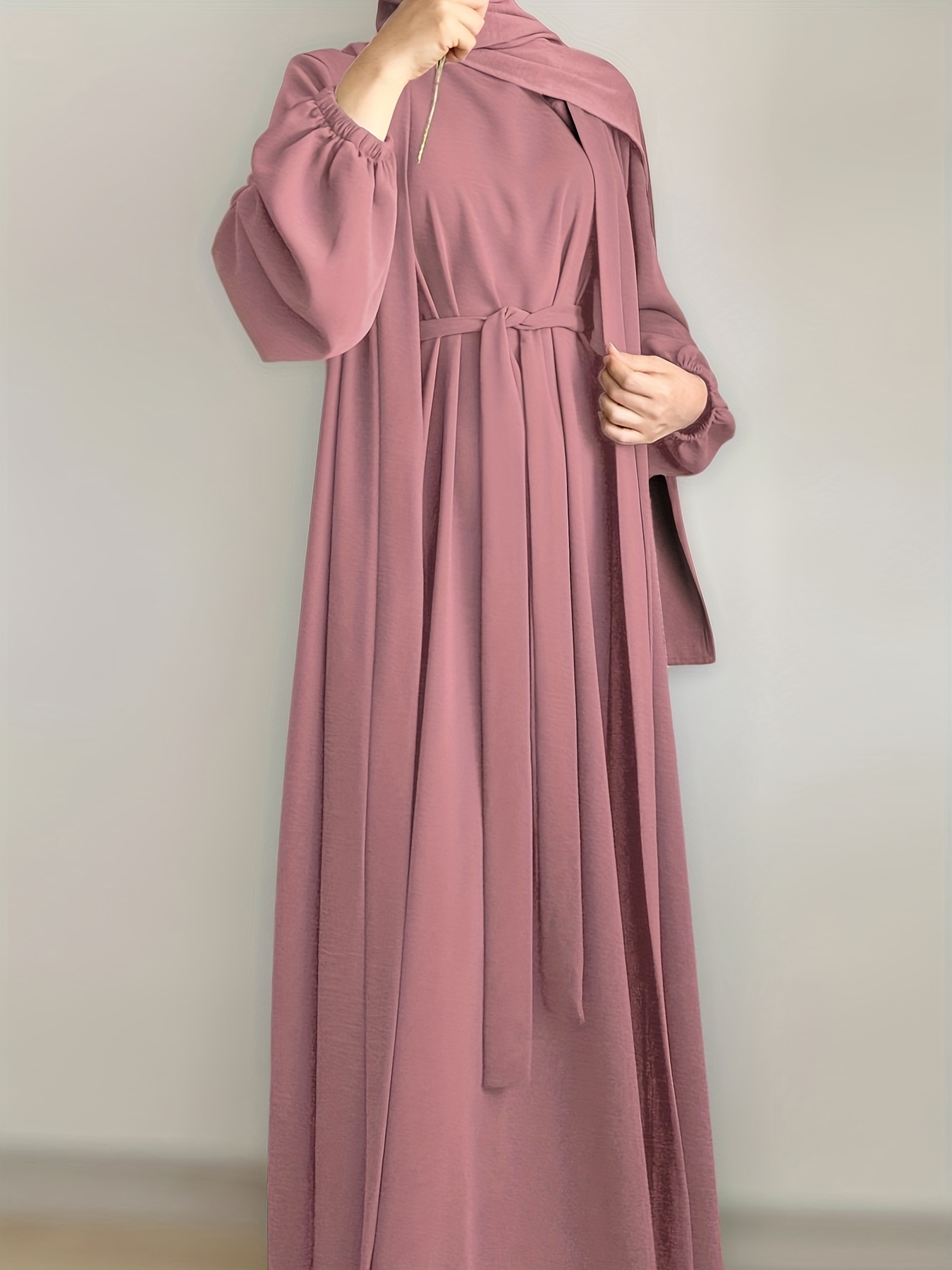 3pcs Traditional Middle Eastern Abaya Dress Set - Long Sleeve, Belted Waist, Solid Color, Non-Stretch Fabric, Spring/Summer/Fall Wear, Includes Cardigan, Dress, and Headscarf, Cultural Attire|Traditional Attire|Belted Waist Dress