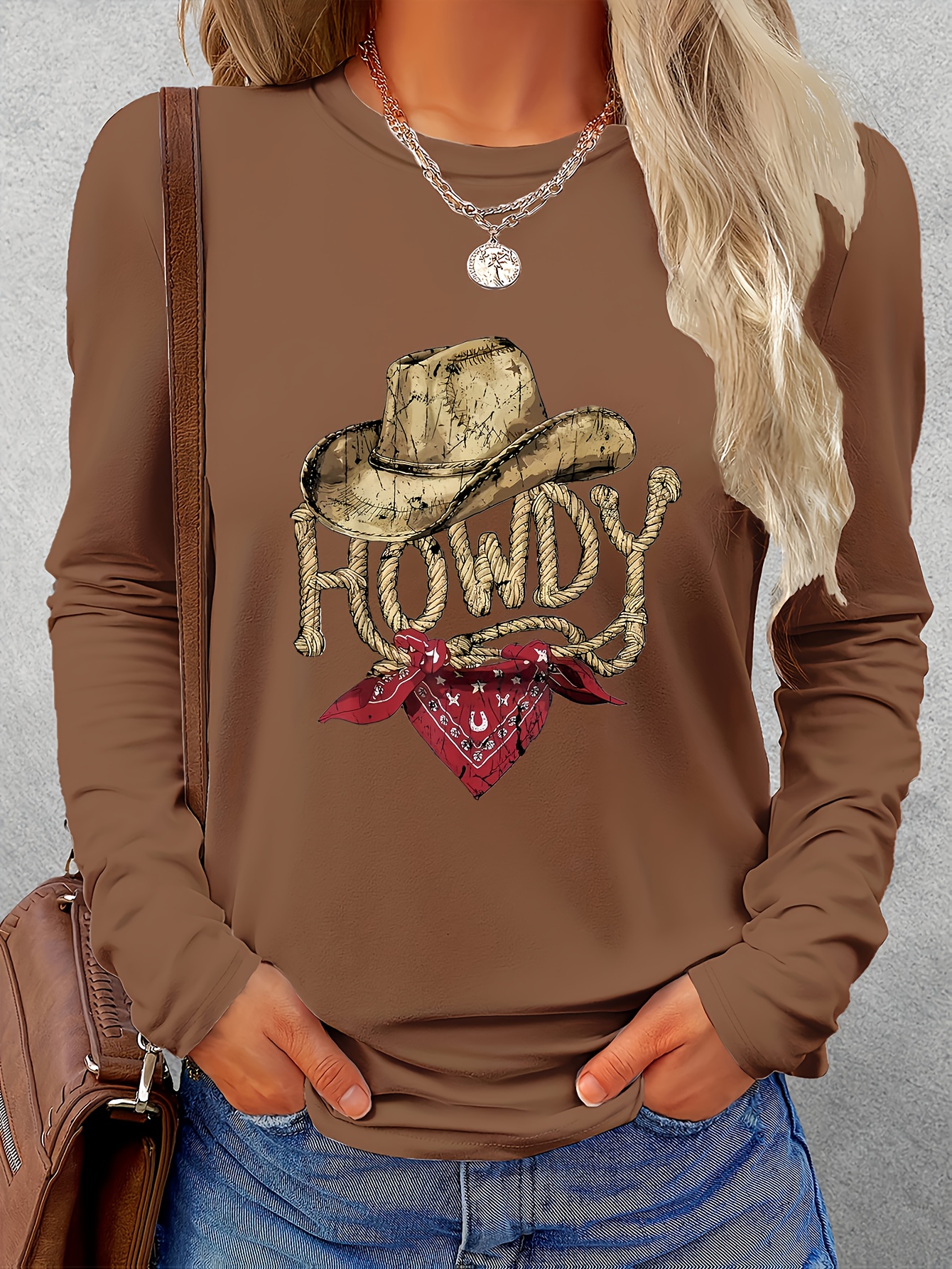 Women's Western Cowboy Graphic Long Sleeve Top - Vintage HOWDY Print with Hat & Bandana Design, Soft Grey All-Season Casual Shirt, Machine Washable Round Neck Women's Clothing, Seasonal Fashion, Comfortable Fit