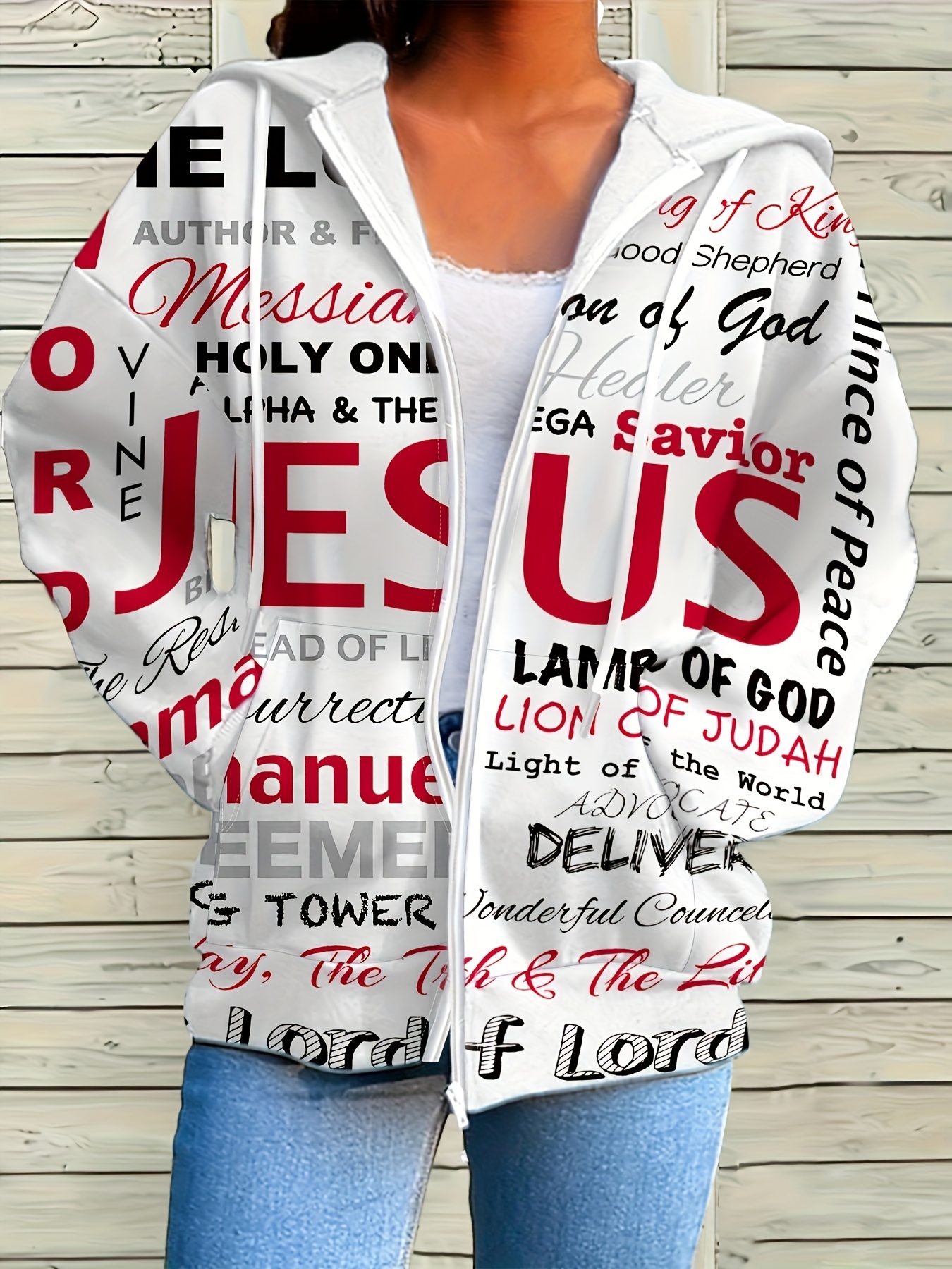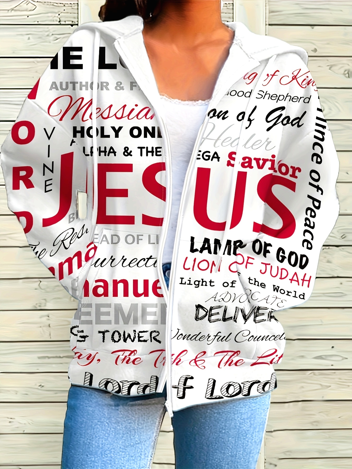 Women'S White Hoodie with Inspirational Christian Quotes - "Jesus" Design, Long Sleeve Zip-Up Hooded Sweatshirt, Casual Streetwear for Fall & Winter, All-Season Comfort, Casual Wear Hoodie | Inspirational Hoodie | Zippered Hoodie