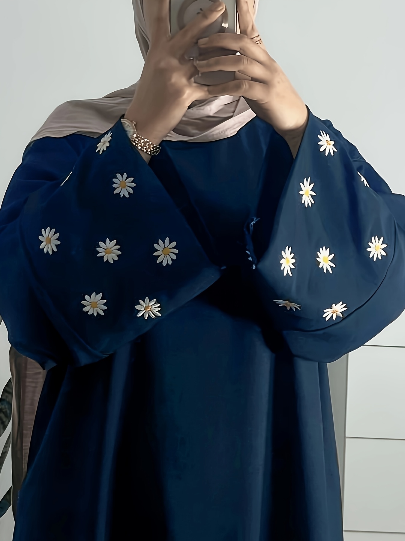 1pc Women's Islamic Abaya Dress - Elegant Hijab Outfit with Cuff Floral embroidery, Navy Blue Arabicrobe, Loose Fit Non-Stretch Muslim Dress for Daily Prayer, Office, Travel - No Scarf Needed, Modest Apparel, Quality Embroidery Detail