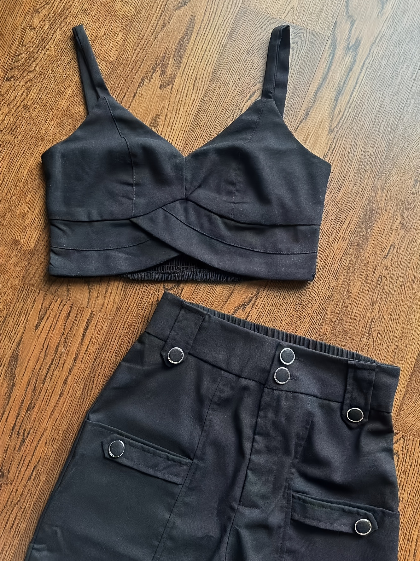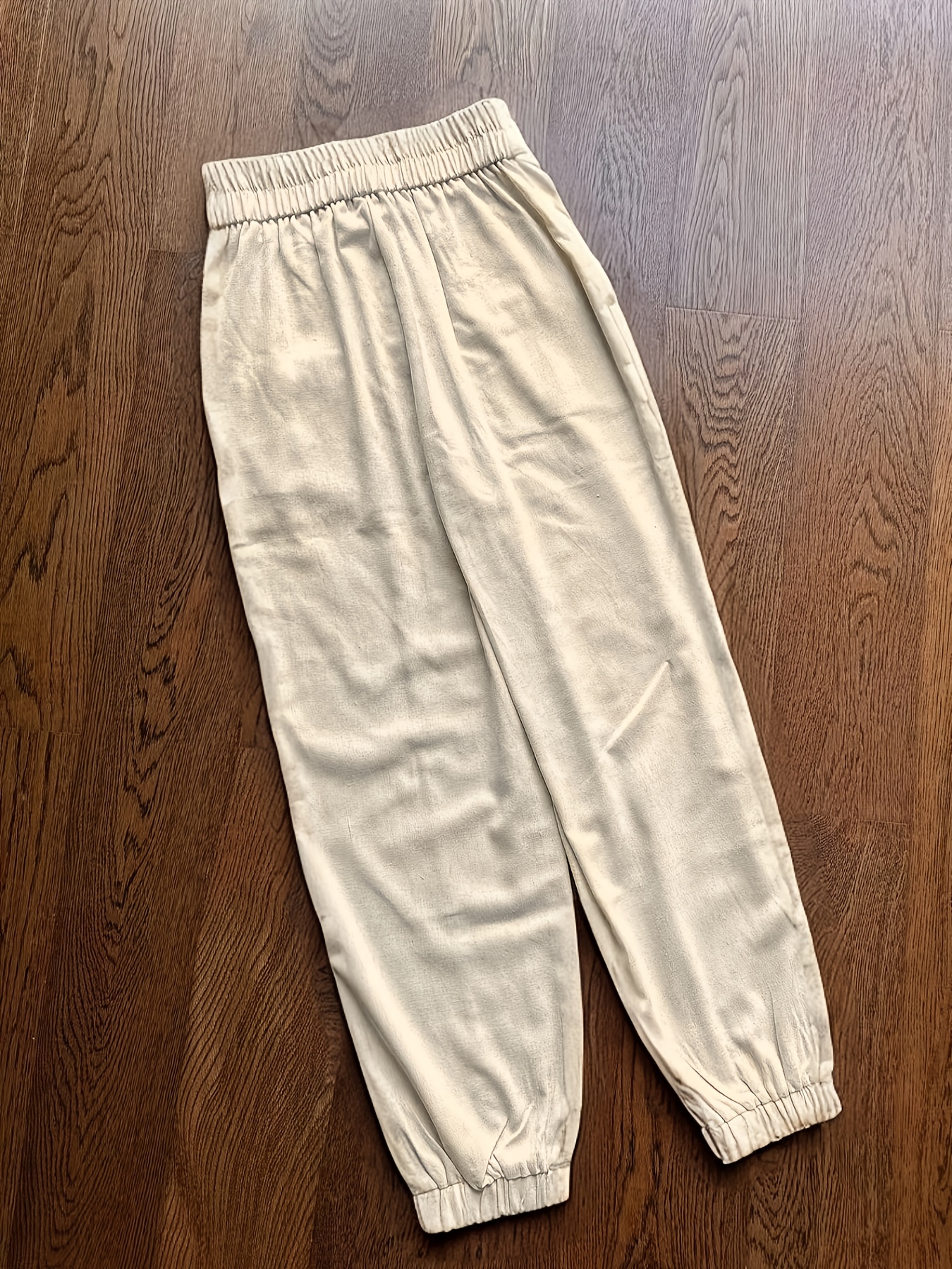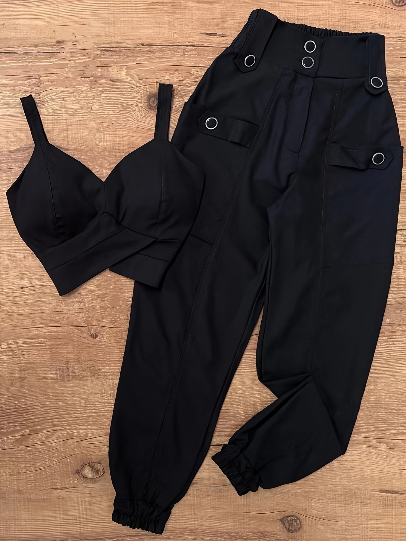[Elegant Beige Top & Pants Set] Elegant Beige Sleeveless Top & Button-Pants Set - Chic V-Neck Ruffled Detail Shirt with High-Waisted Wide-Leg Pants, Casual or Office Wear