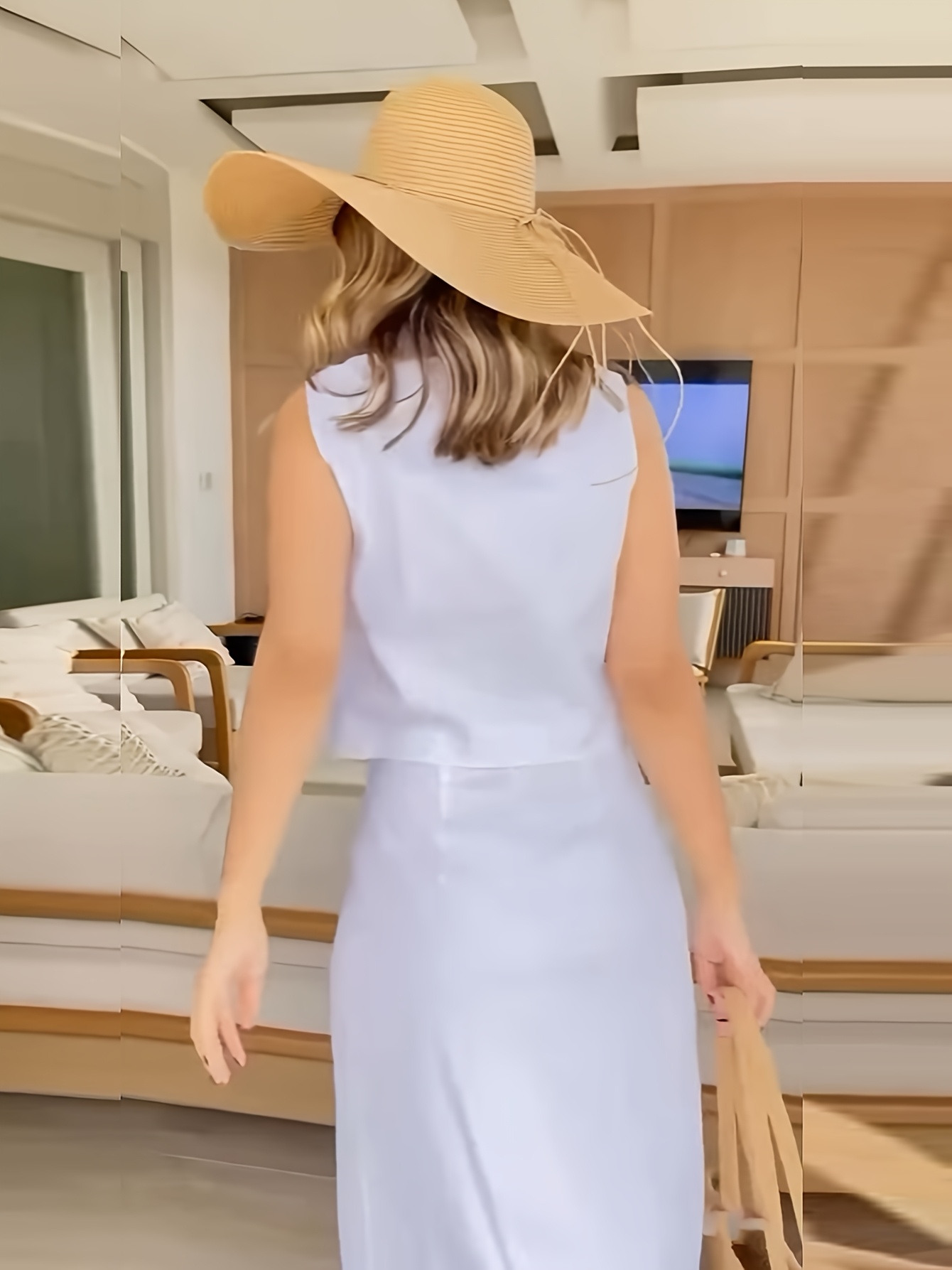 Elegant Sleeveless Blouse & High-Waisted Skirt Set - Chic Open Collar, Button Detail, Flowy Design for Women - Perfect for Spring/Summer, Office or Casual Outings, Office Attire|Sleek Formal Attire|Polyester Fabric