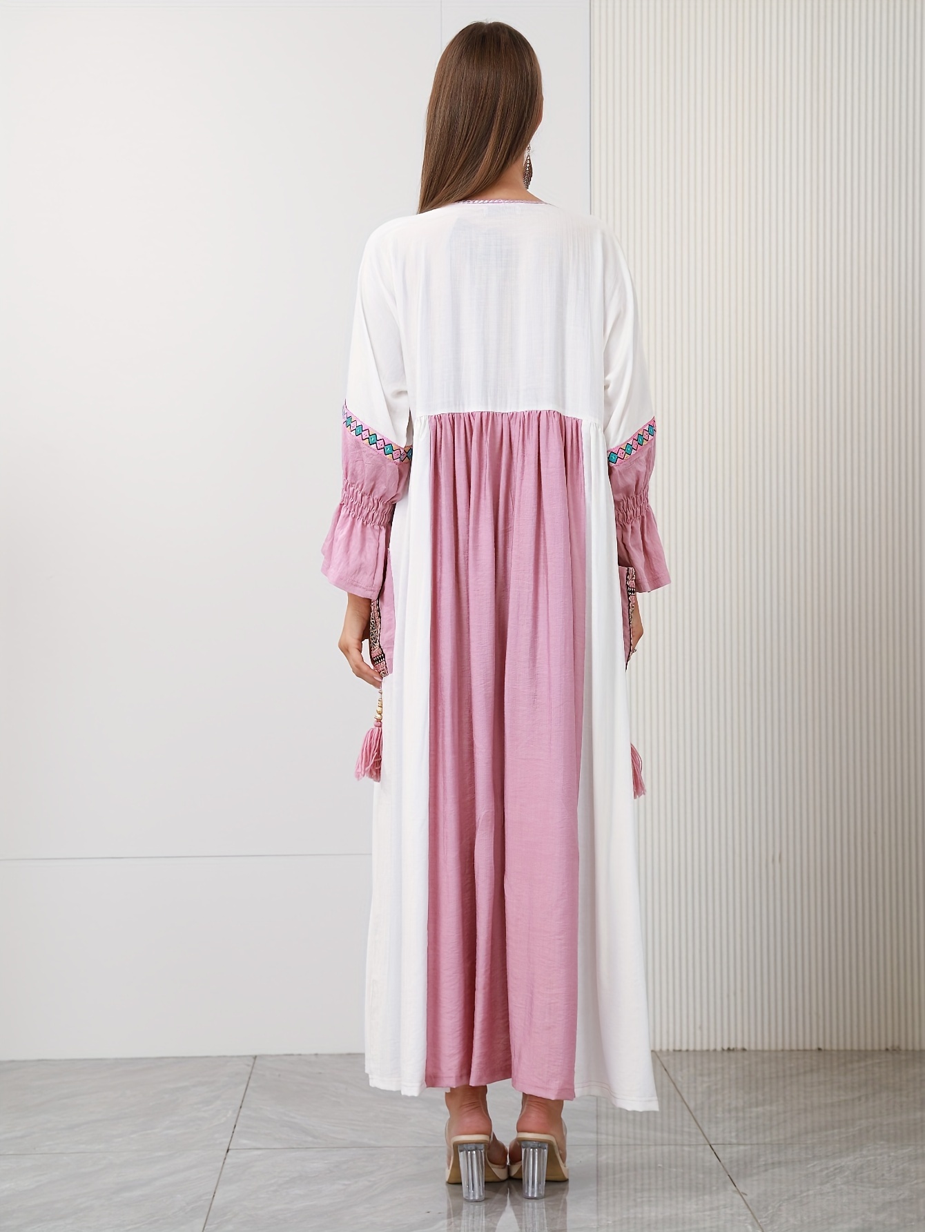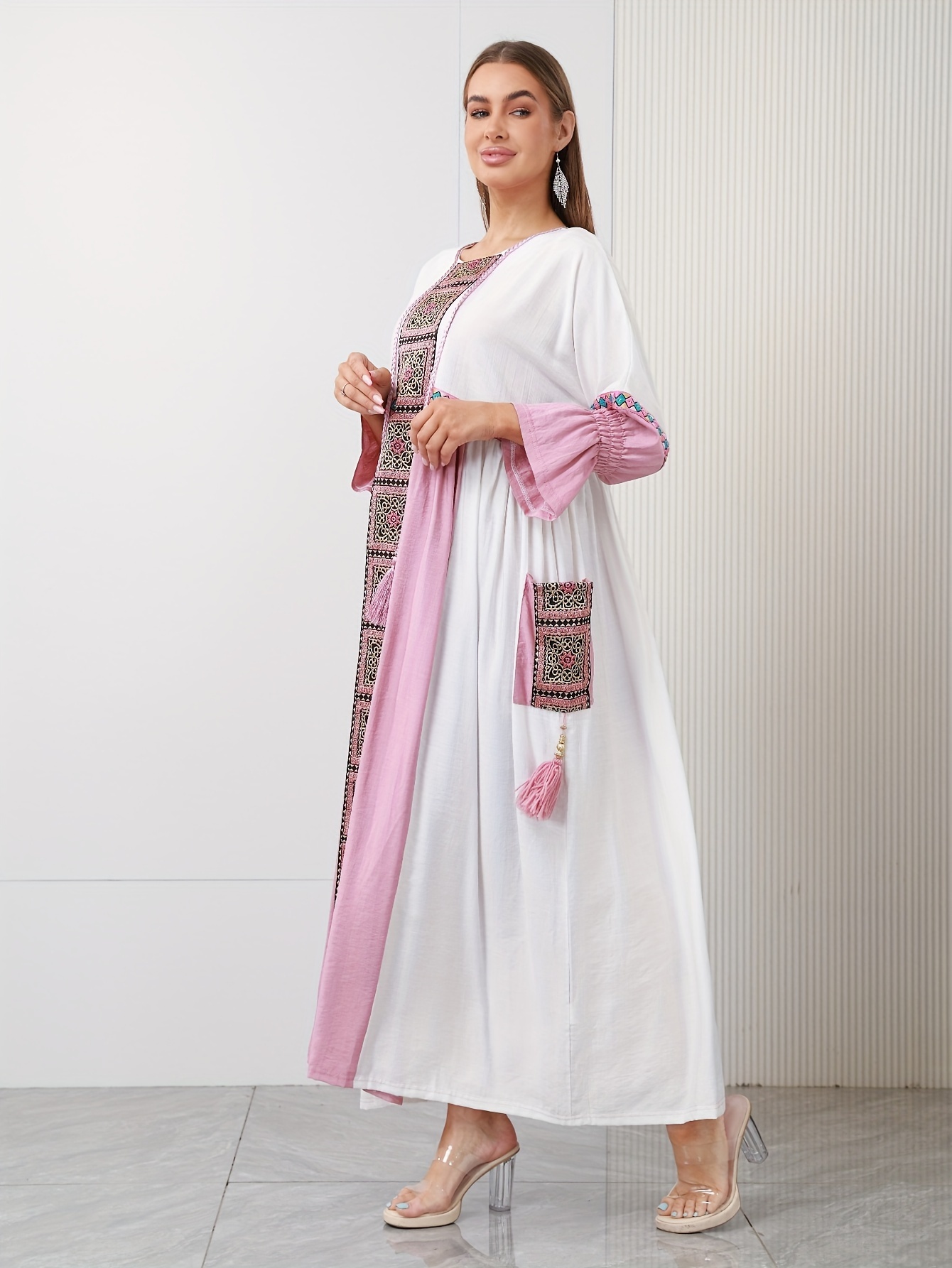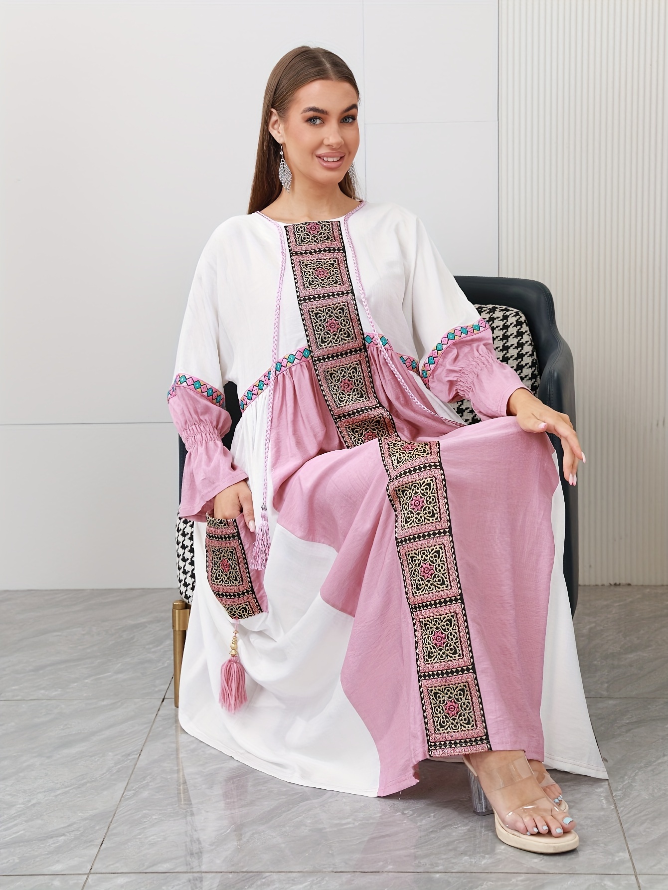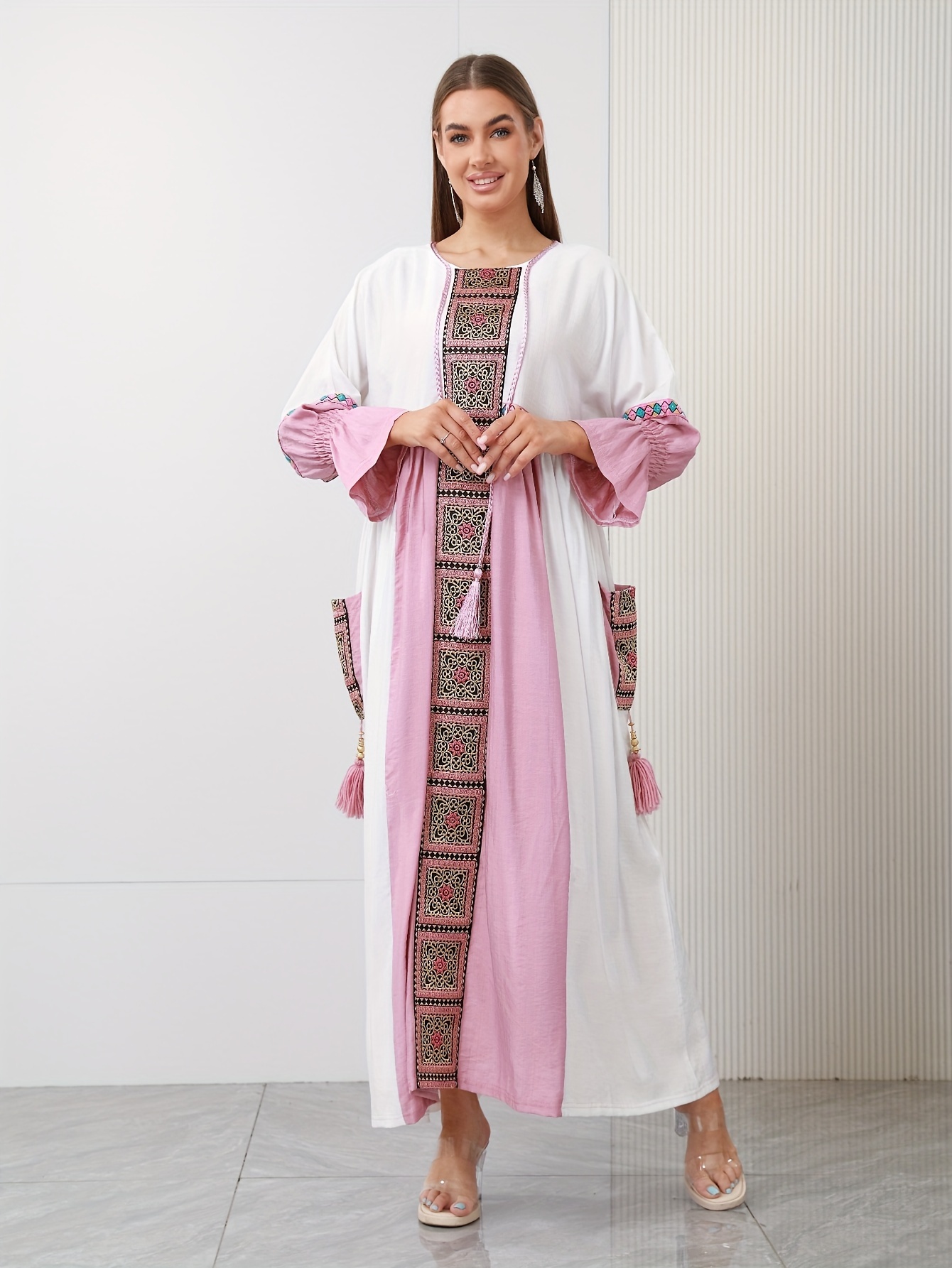 New Design Directional Palace Style Heavy Embroidery Pink Tassel Pendant Ruffle Elastic Three-Quarter Sleeve Double-Pocket Gown for Saudi National Day