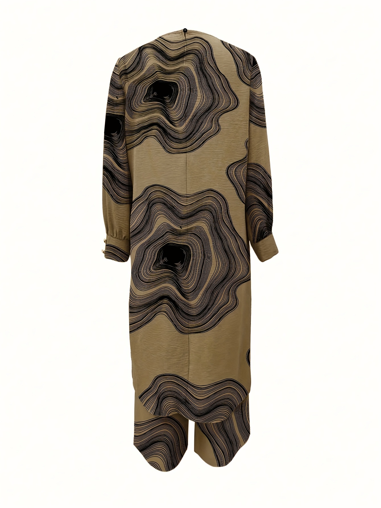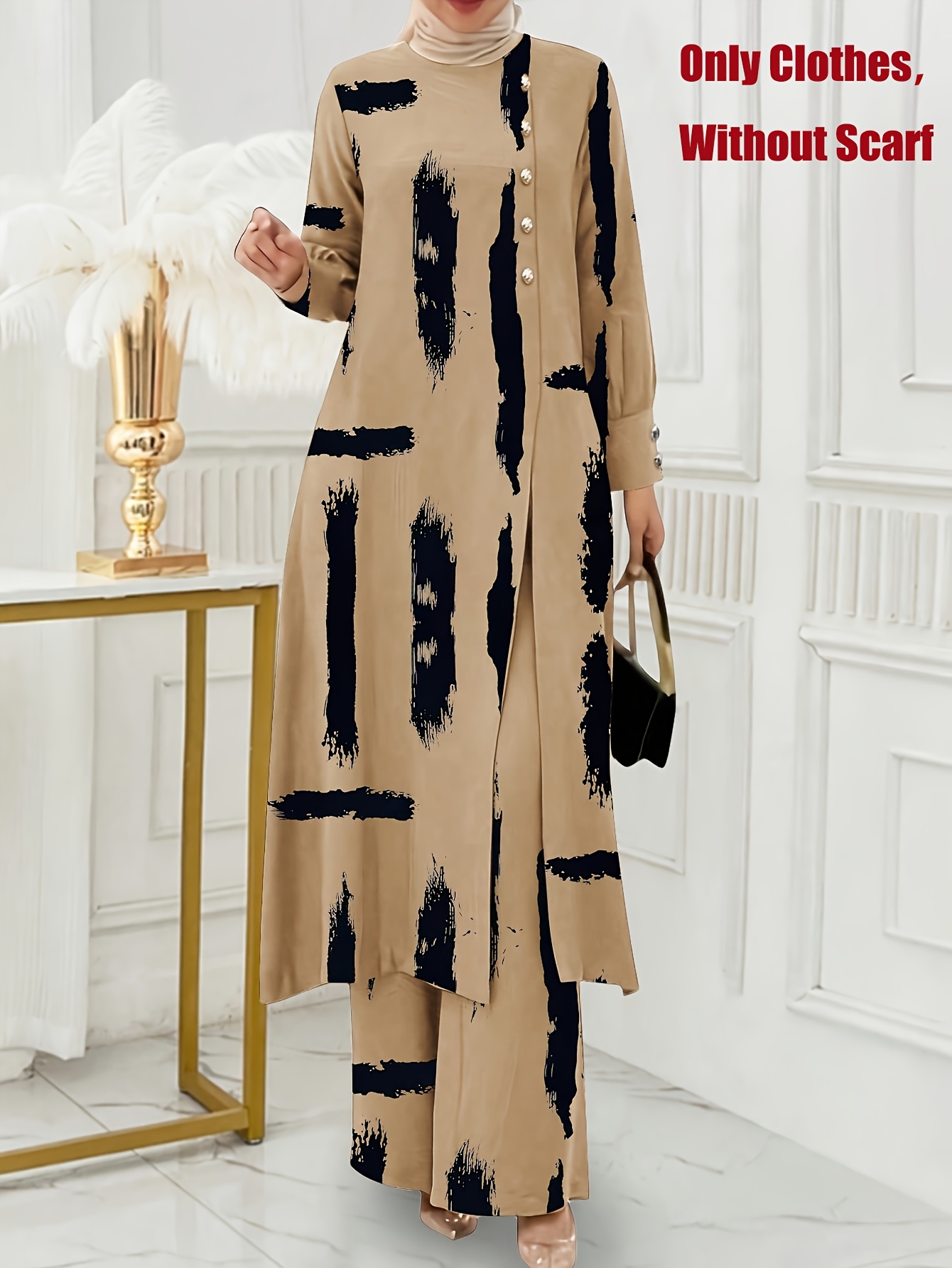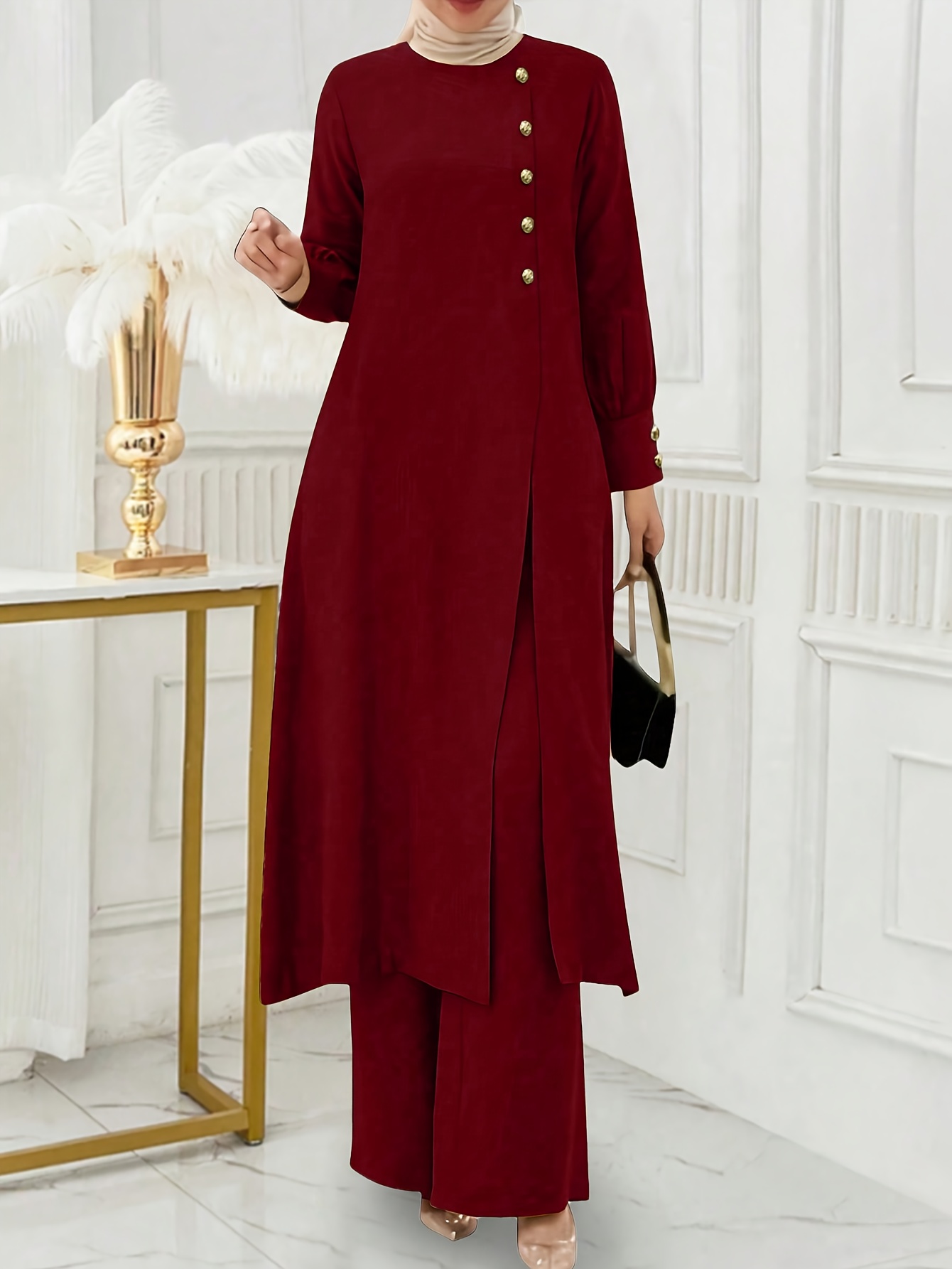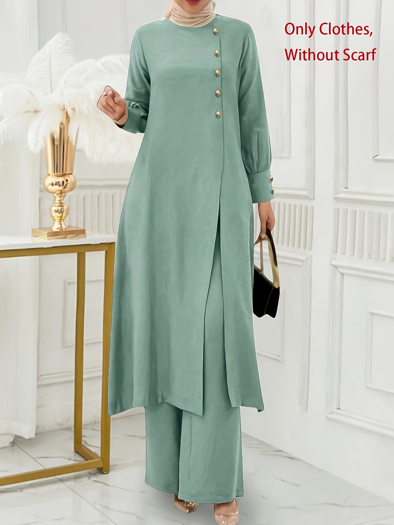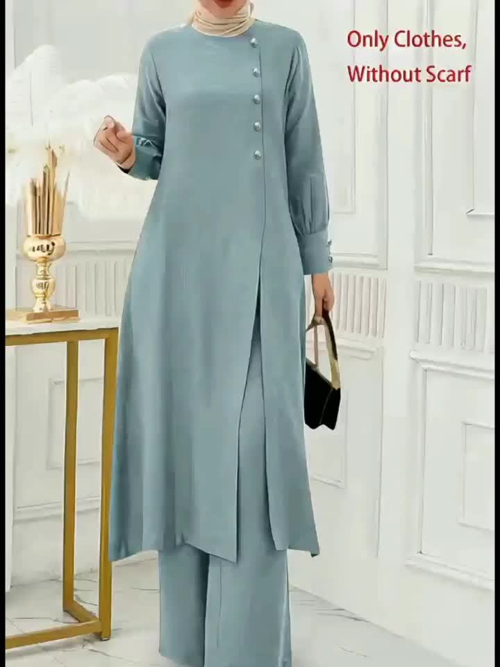 [Ramadan Top Set] Ramadan Solid Color Long Sleeve Top and Pants Set | Arabic Style, Polyester, with Faux Button Detail, for All Seasons, Women's