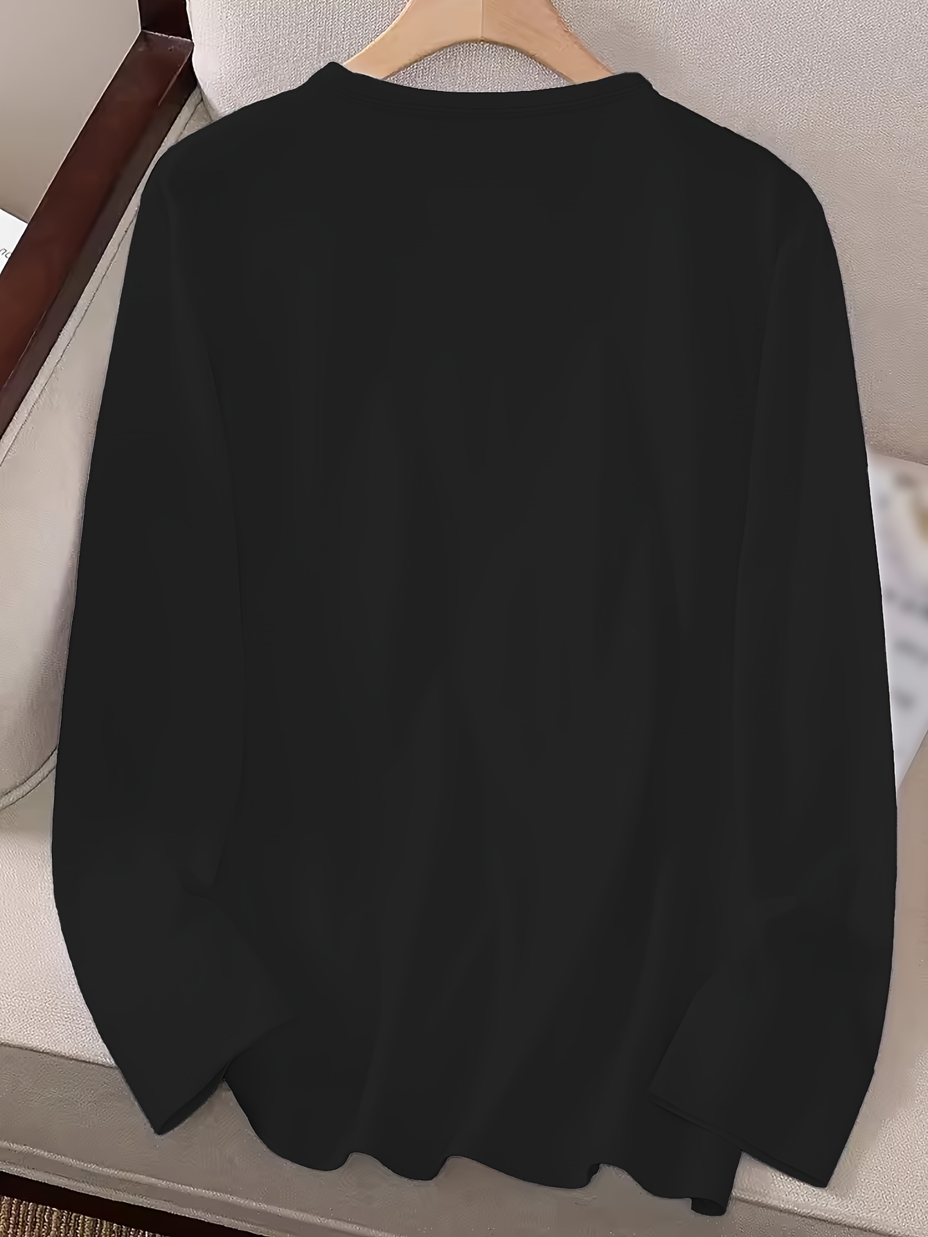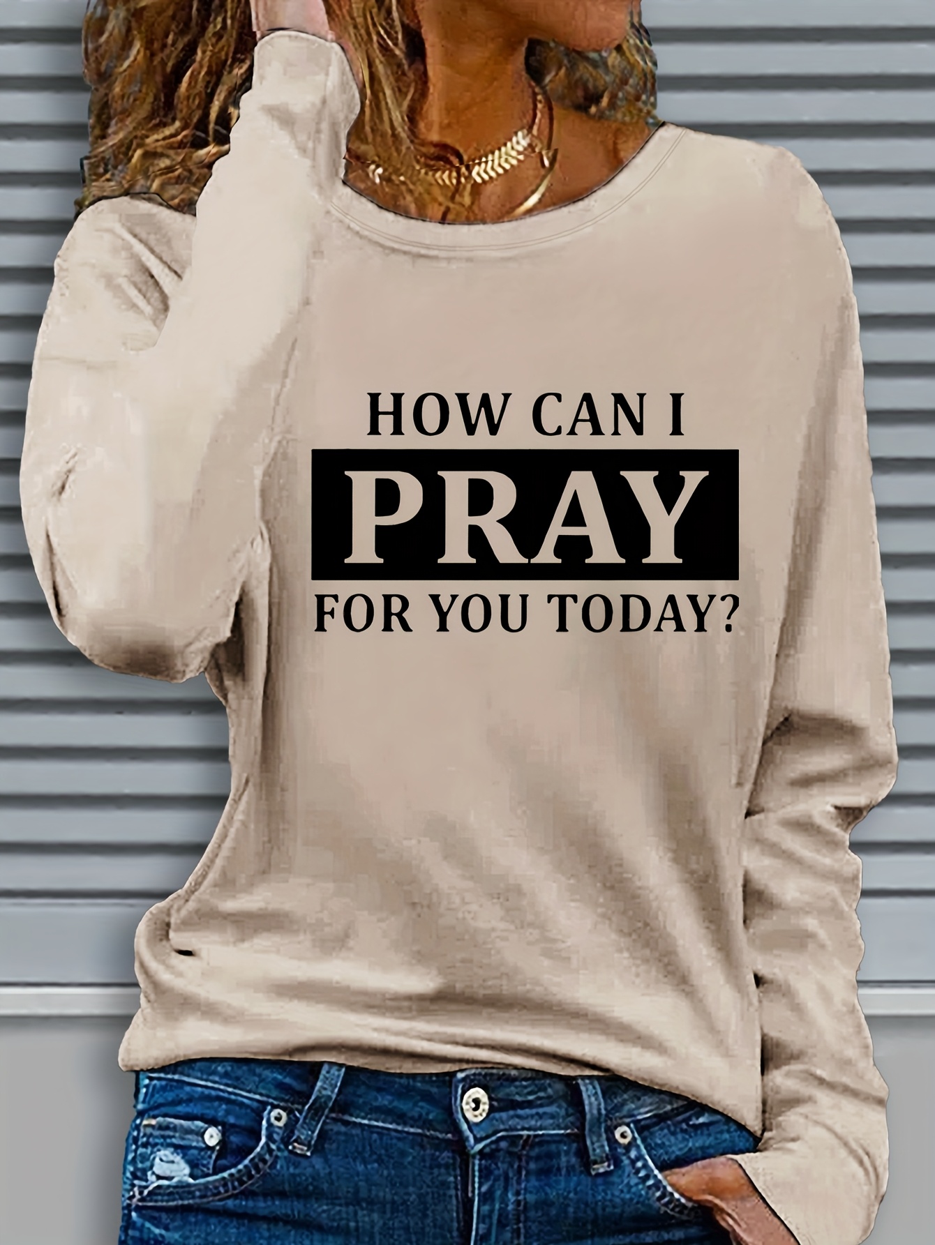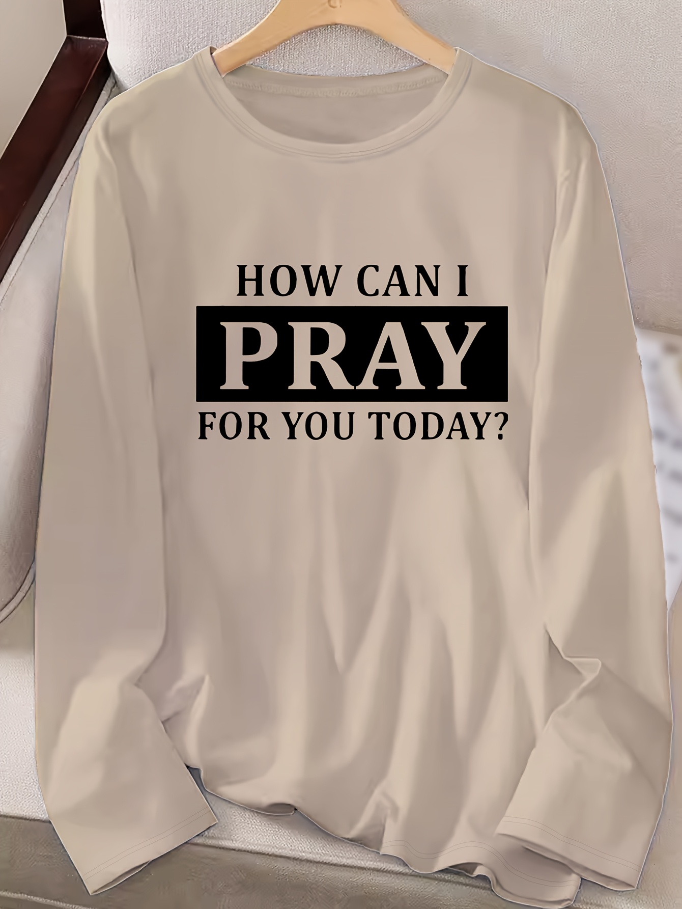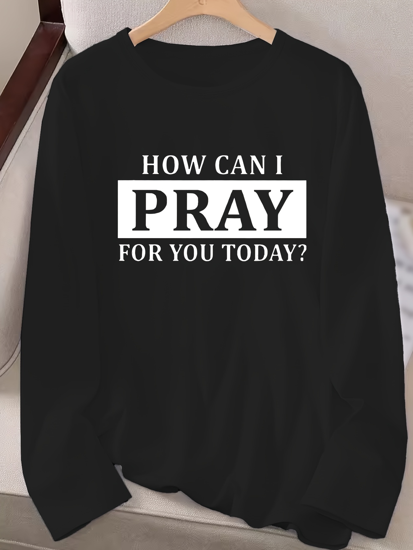 Women's "How Can I Pray for You Today?" Letter Print Long Sleeve Crew Neck T-Shirt - Black with White Text, Casual Regular Fit Top for Fall & Winter, Machine Washable, Comfortable Pullover