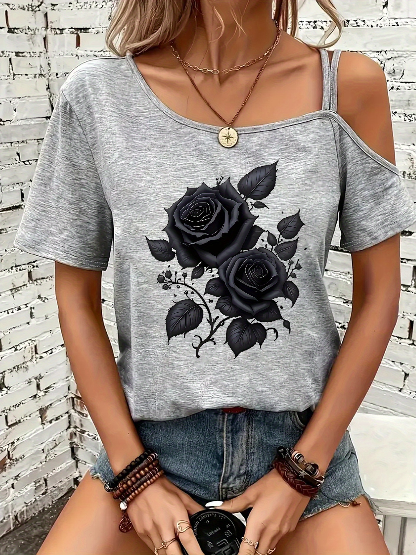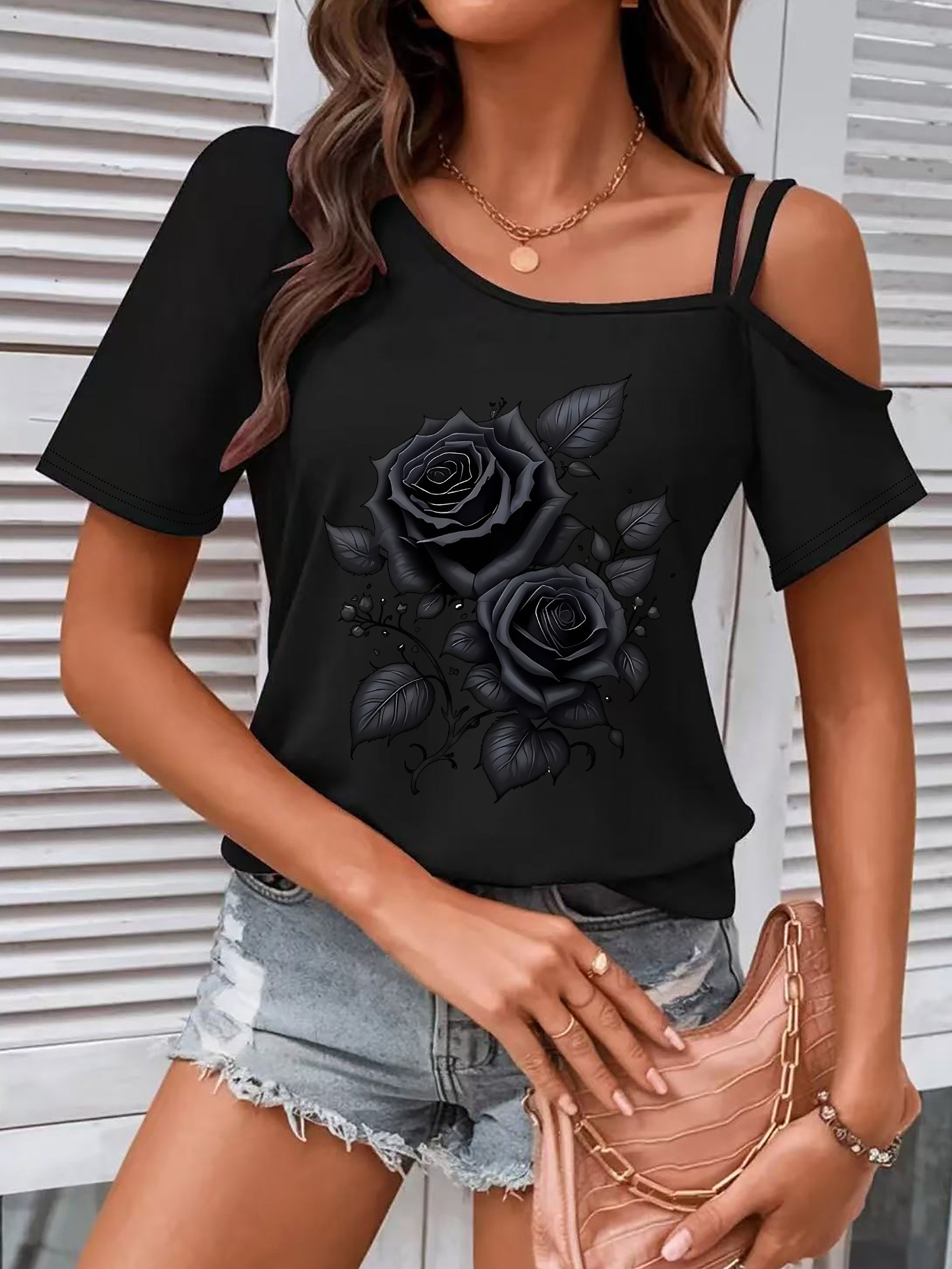 Women's Sexy Off-Shoulder Graphic Print T-Shirt - Black Rose & Butterfly Design, Thin Strap Short Sleeve Summer Top, Machine Washable Casual Chic Blouse for Women, Nontransparent Fabric