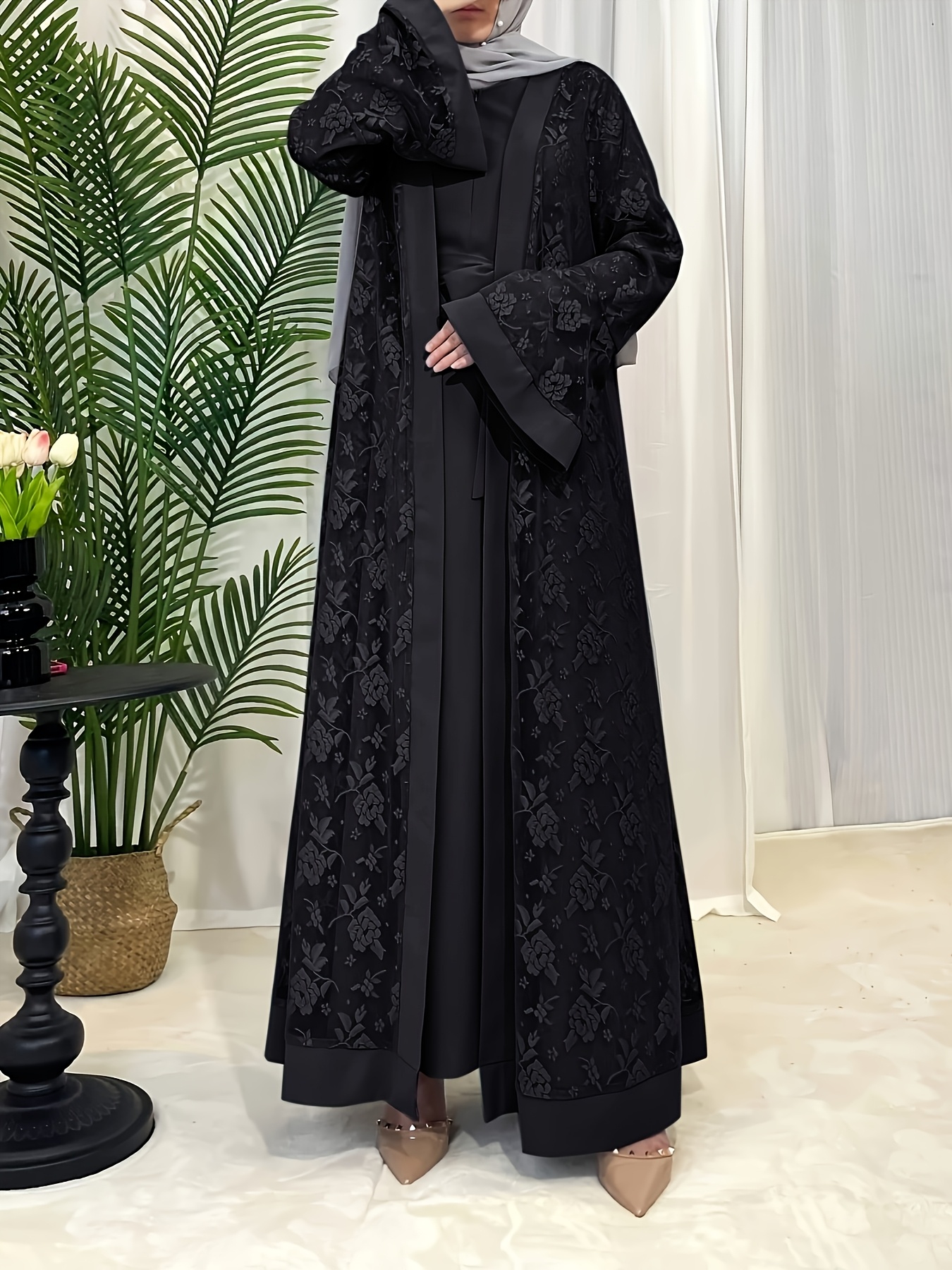 Elegant Black Lace Abaya with Contrast Lace Trim - Long Sleeve, Floor-Length, Belted, All-Season Wear, Traditional Middle Eastern Attire for Women, Cultural Attire|Elegant Abaya|Lace Trim Abaya